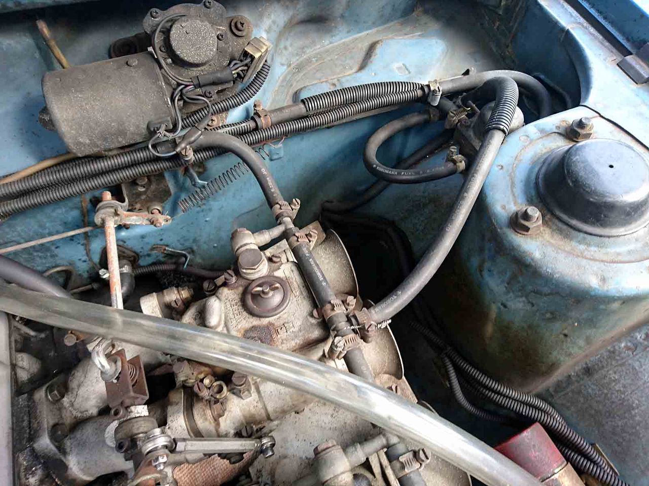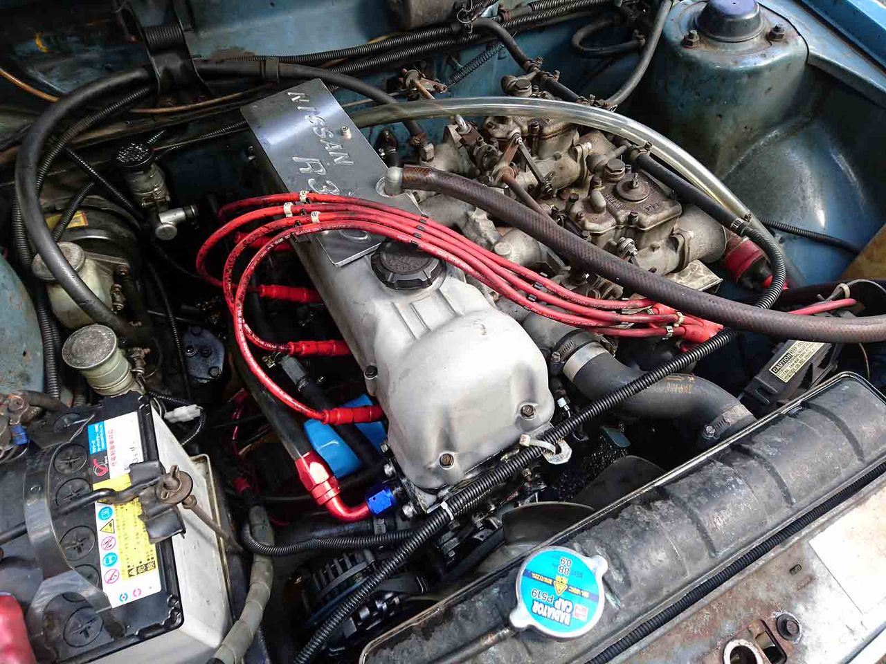 本来F/Rは位置的にキャブに近い位置、真後ろに付けたいんだが、このハコスカは